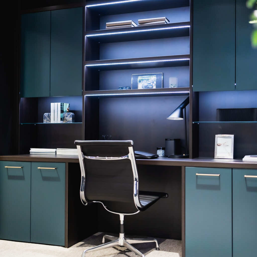 Whether your home calls for a modern office or a slightly more classical study, our wide range of door styles and finishes means we have it all covered. Wiith our creative use of glass and mirrors, even the smallest of spaces can feel spacious and luxurious