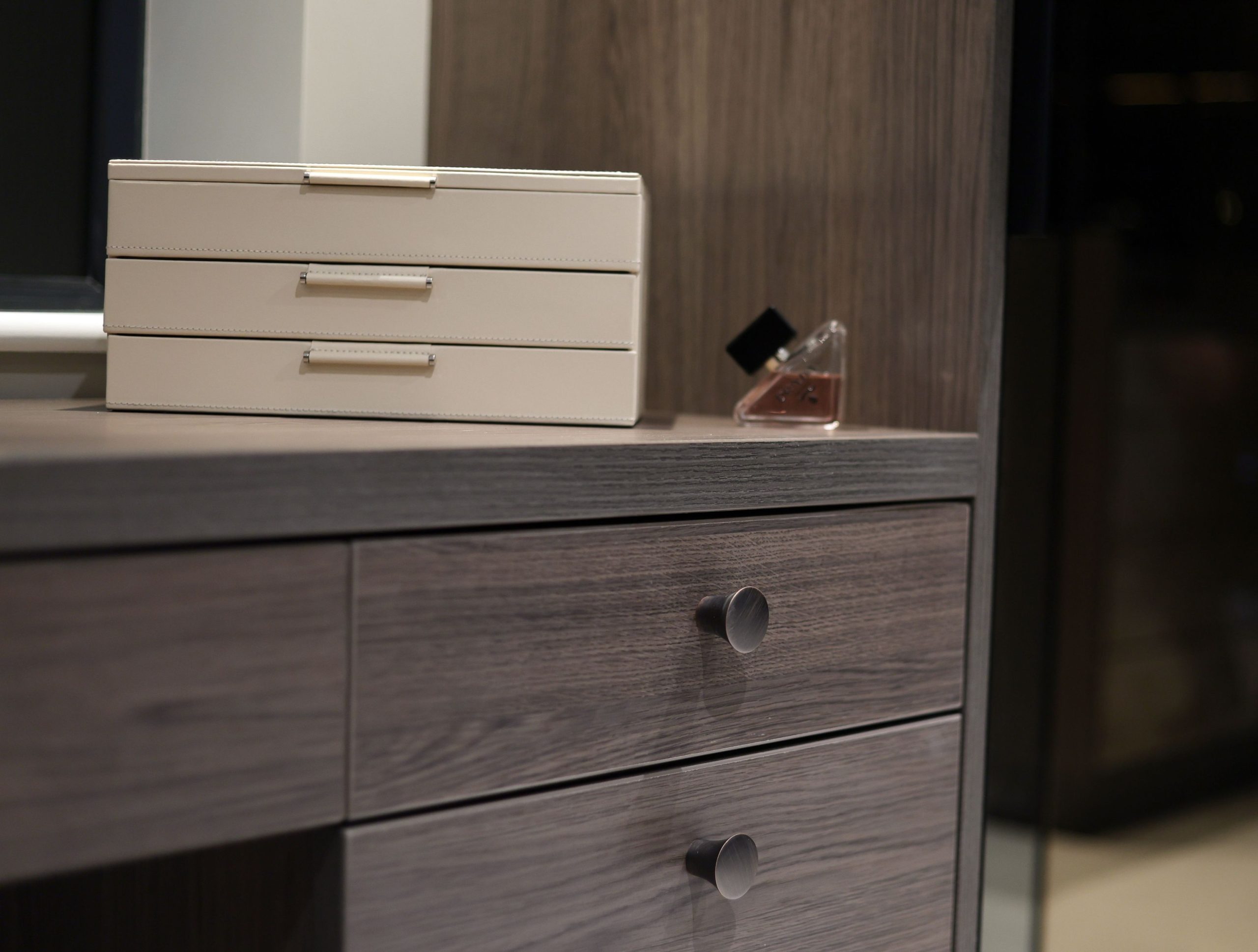 Our team of expert designers worked closely with the client to ensure that their interior design vision was brought to life. We helped choose the perfect colours and finishes, and designed bespoke wardrobes, accessories storage, and angled shelving. The client loved the symmetry and the neatness of everything being aligned.