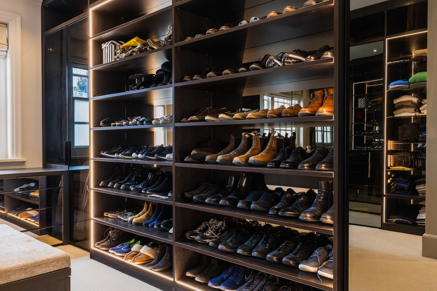 For this project our Bronze Reflex Glass wardrobes were paired with open shelving to house 100 pairs of shoes, and finished with inlaid LEDs to create a lux dressing room.